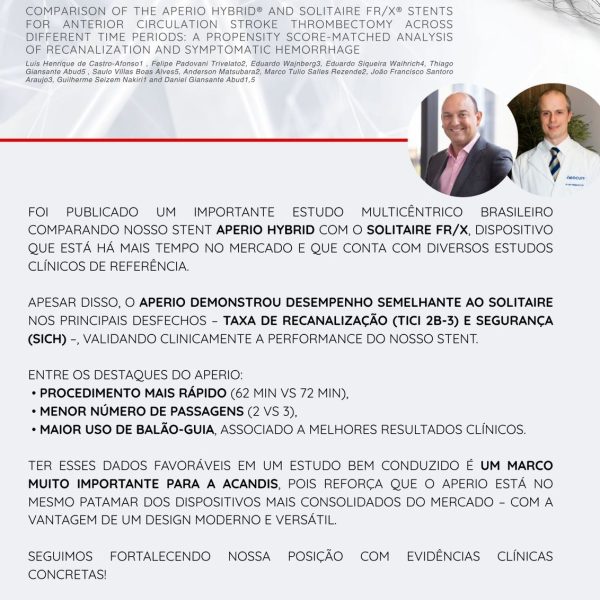 Recentemente foi publicado um estudo multicêntrico brasileiro comparando o Stent Aperio Hybrid com o Solitaire FR/X, dispositivo que conta mais anos no mercado, e que já passou por diversos estudos clínicos de referência.